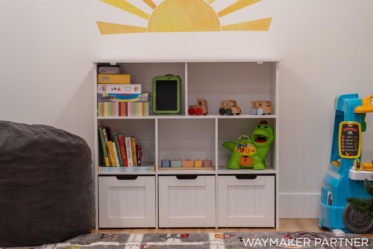 Kid's play zone with toys, games, books, and a food truck playset