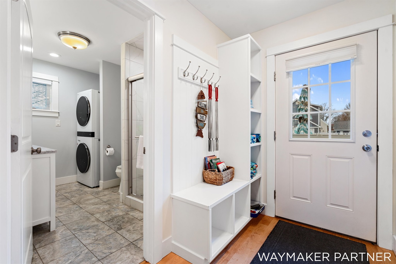 Shared bathroom with a shower and washer/dryer