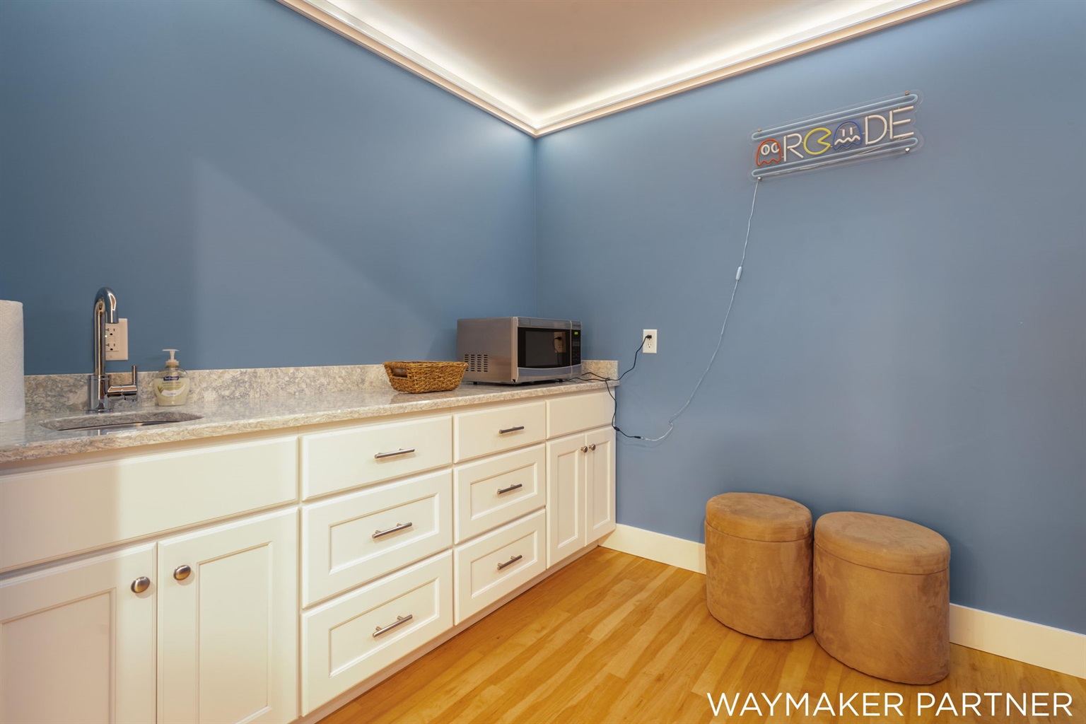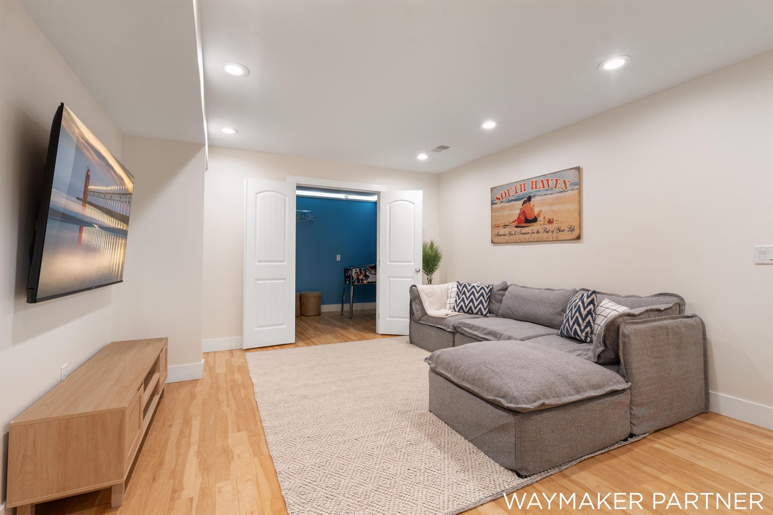 Entertainment area with large sectional sofa, 65" smart TV, and arcade games, pull-out futon also in the basement