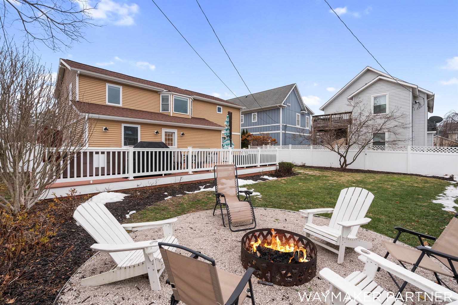 Private patio with ample seating, hot tub, and large backyard with a fire pit