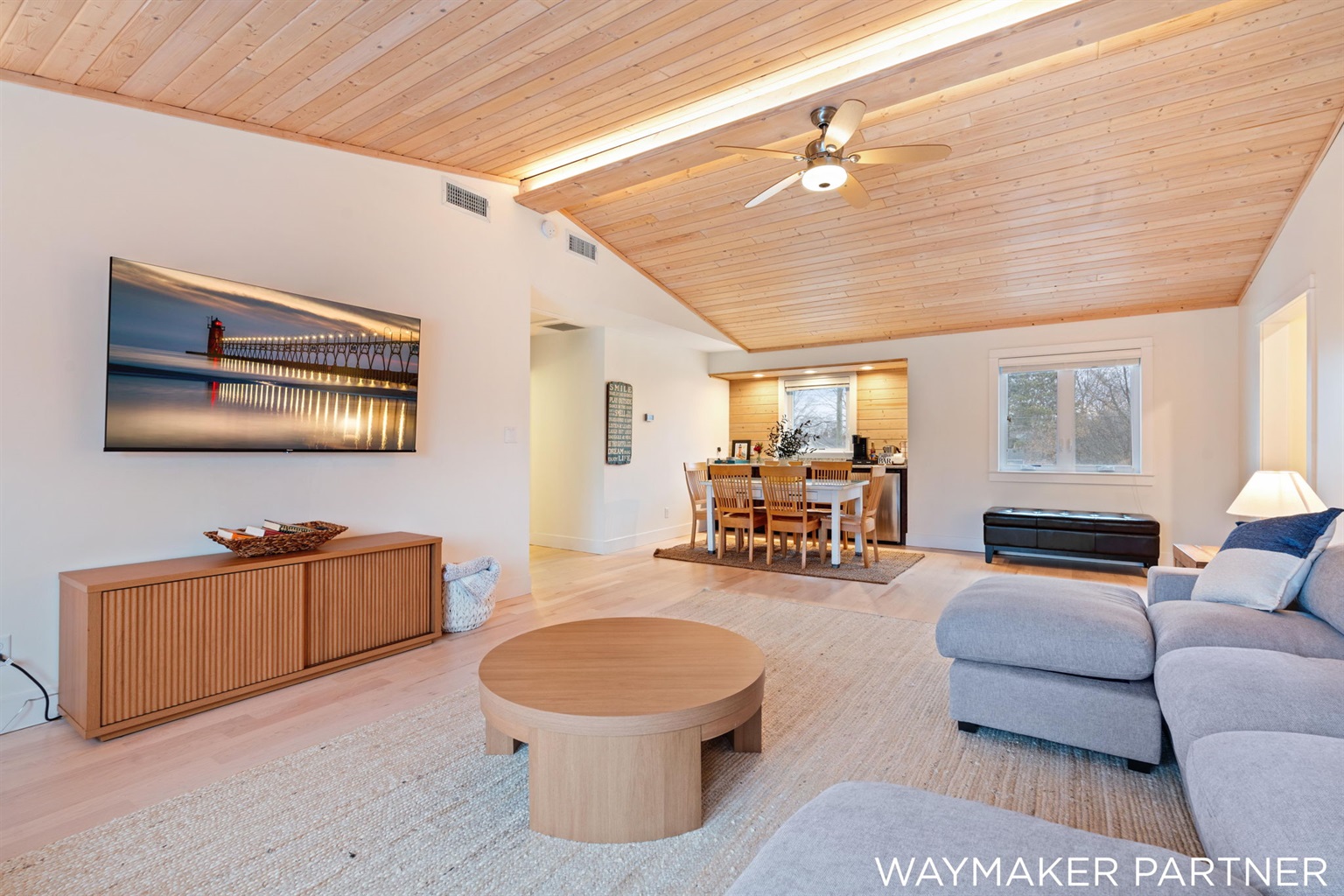 Spacious family room with a large sectional sofa (can double as a bed) and 65" smart TV