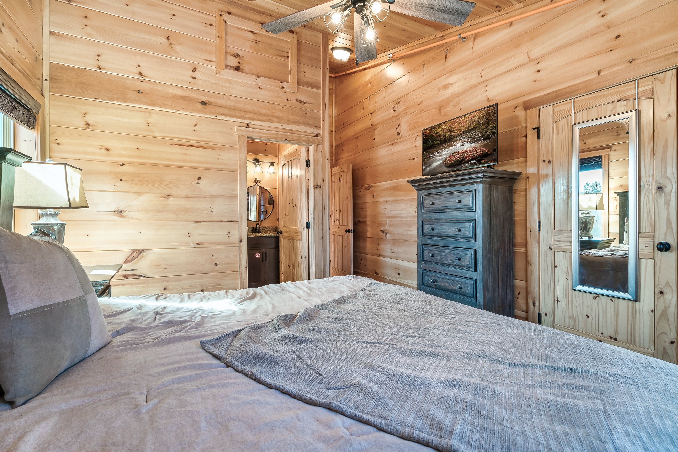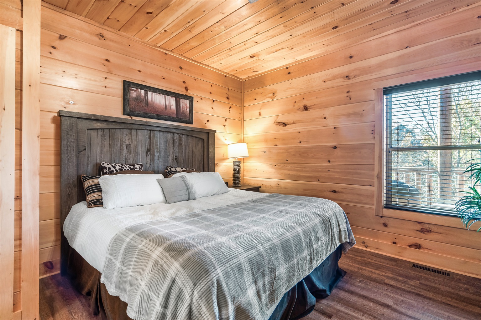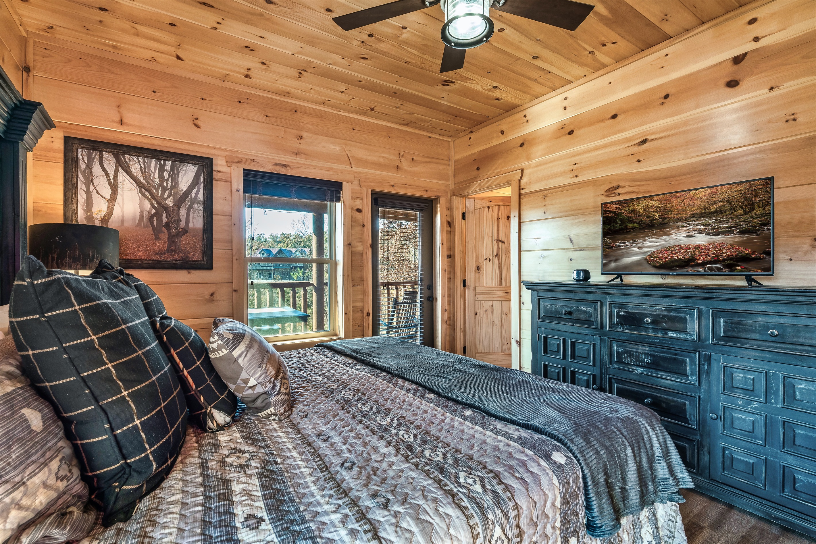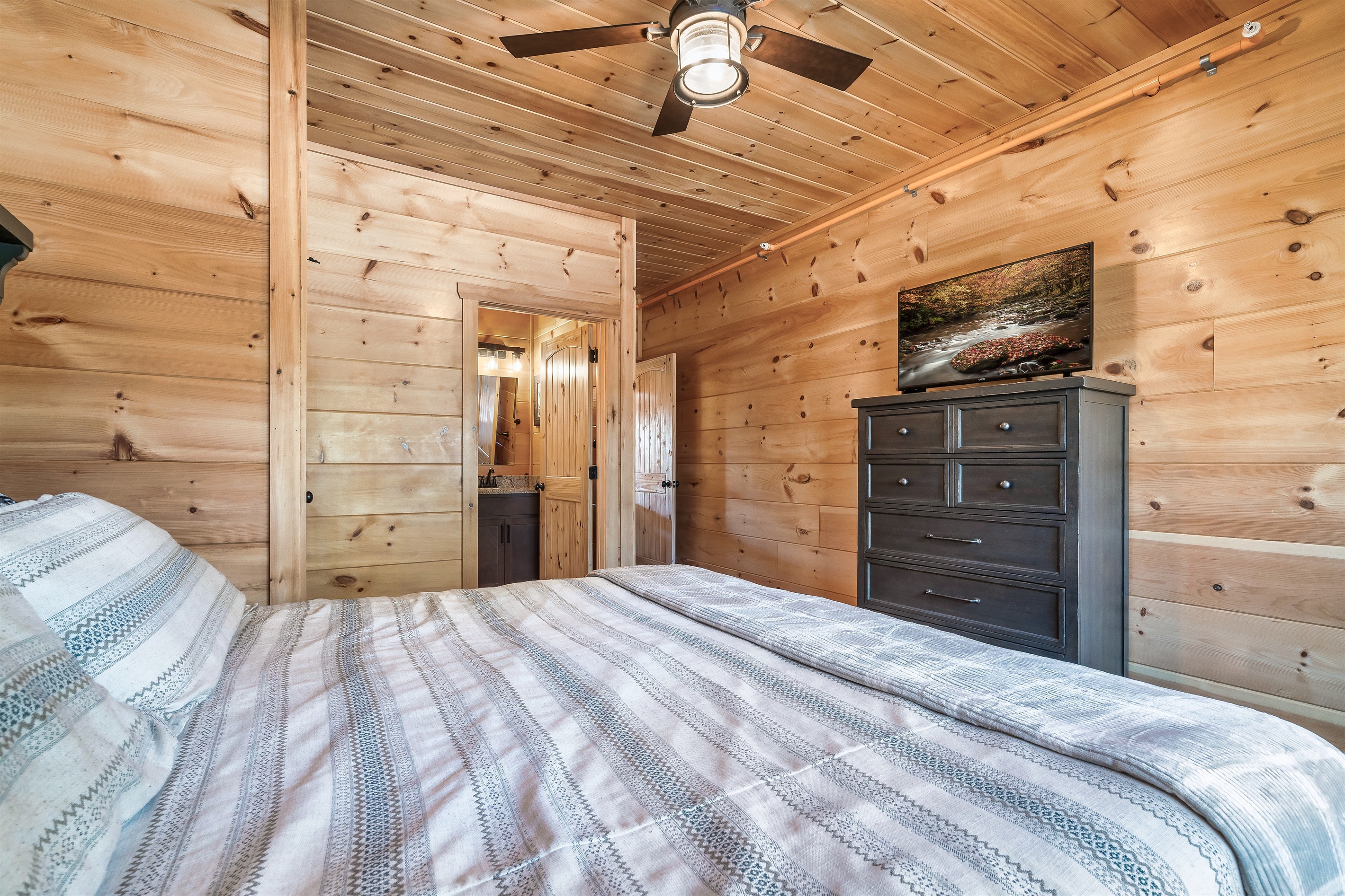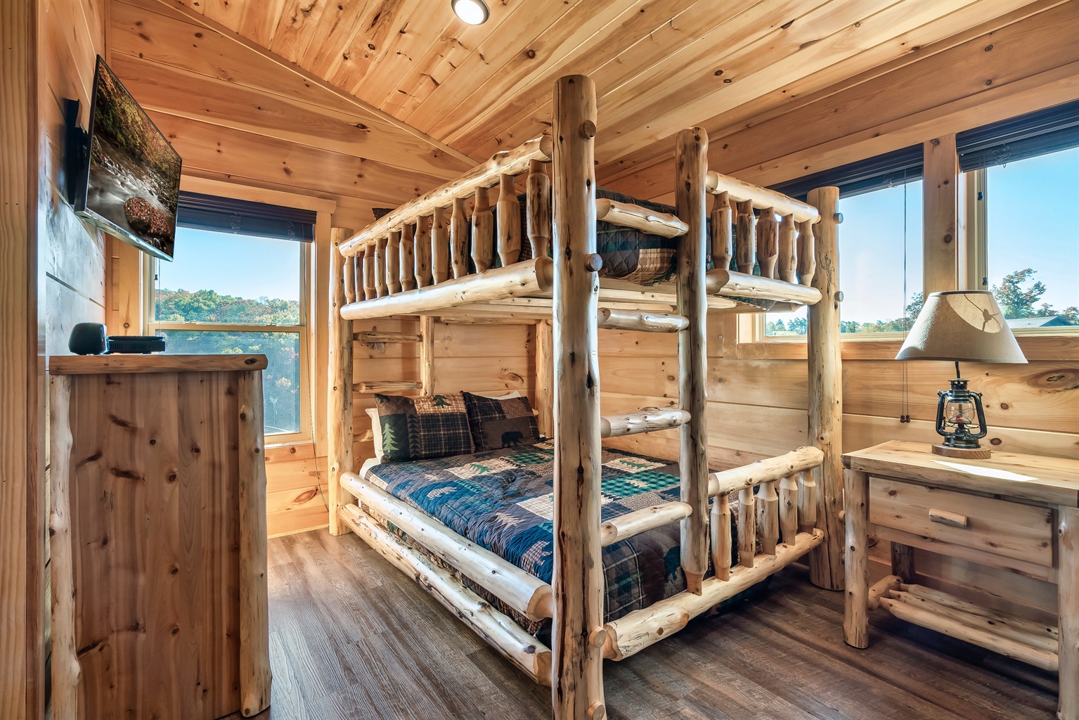 This level features a fun bunk room that sleeps eight, complete with its own private bath — a perfect retreat for kids or a larger group of friends. Two additional king en-suite bedrooms share access to a balcony, where you can enjoy your morning coffee while soaking in the peaceful Smoky Mountain sunrise.