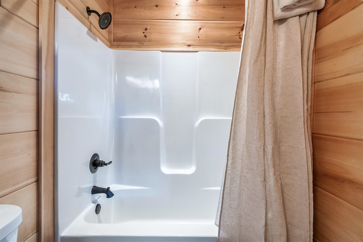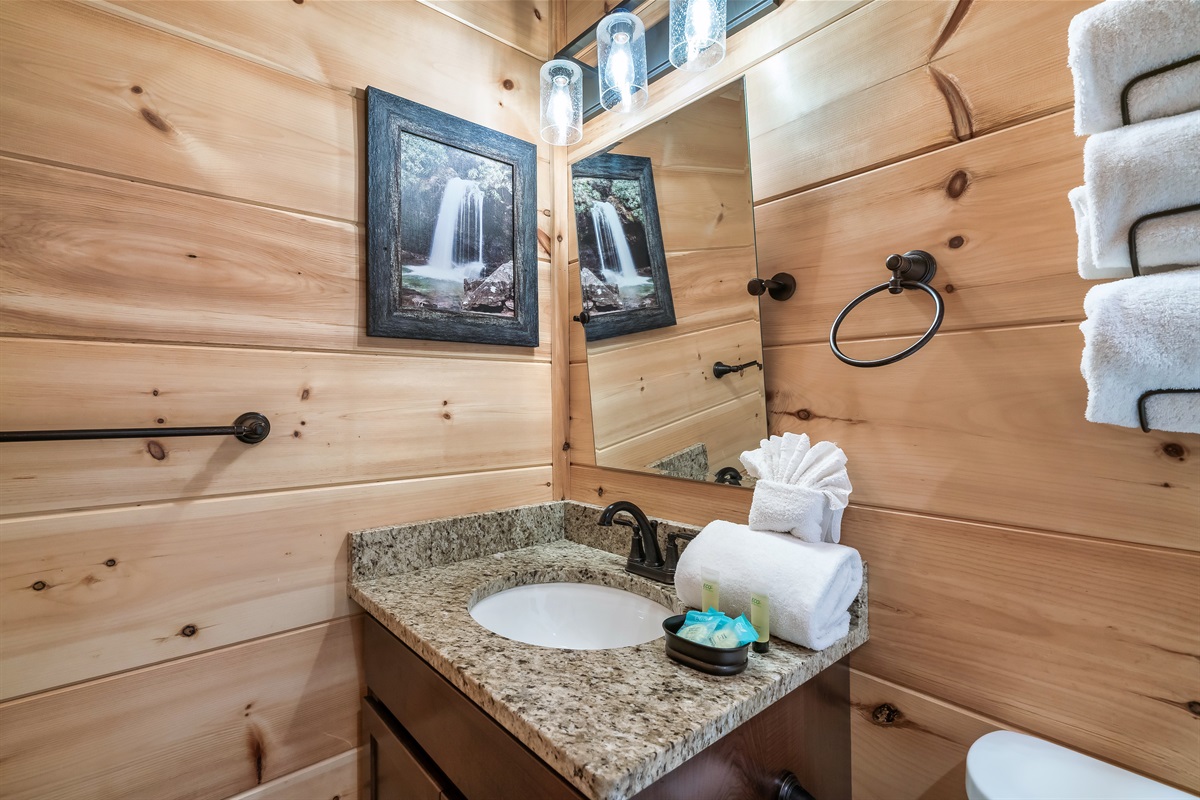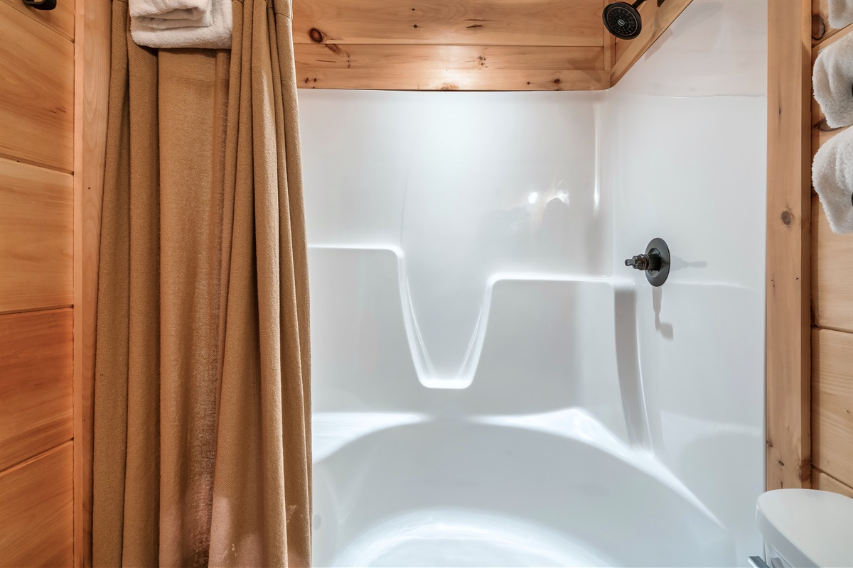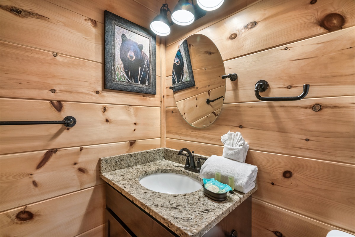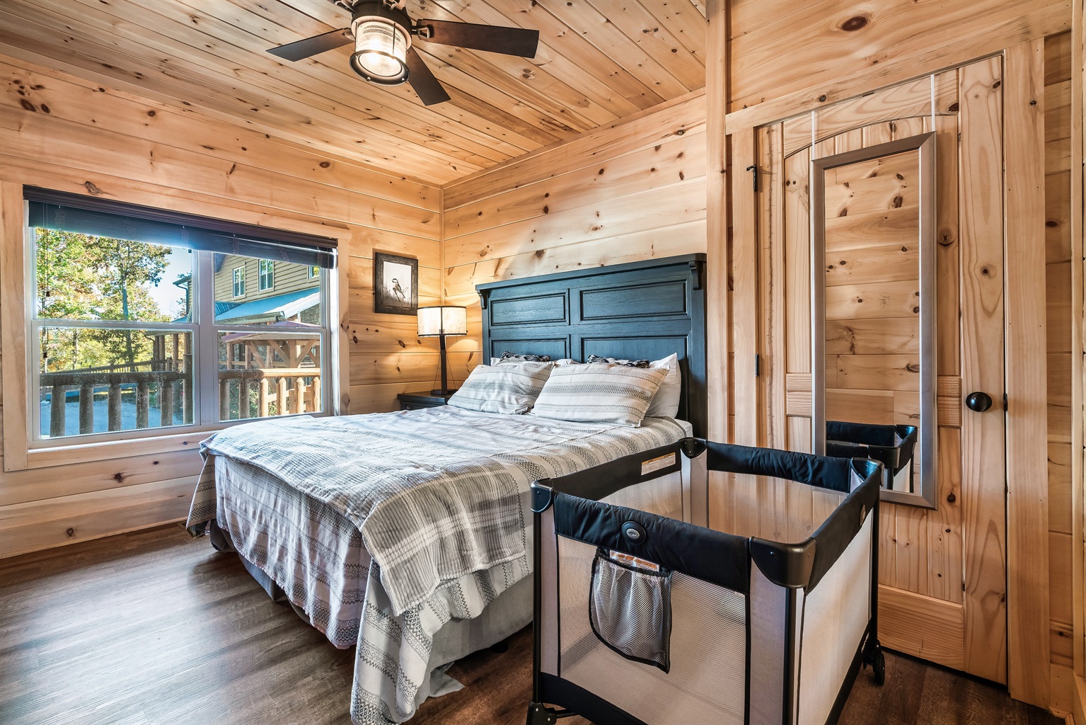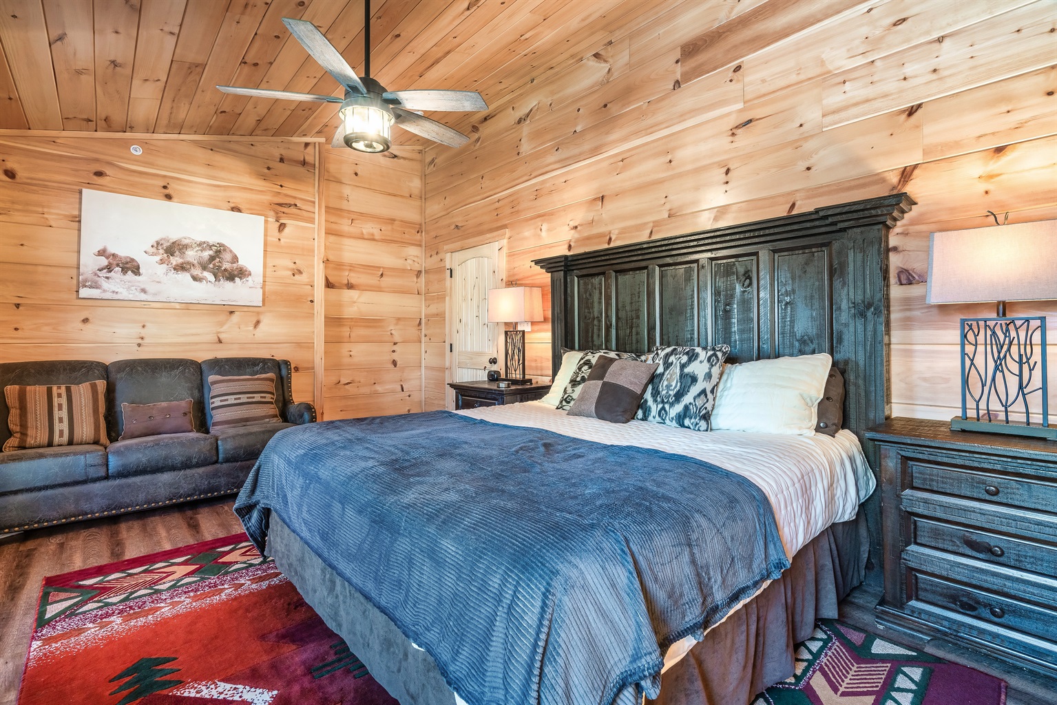 This level features a fun bunk room that sleeps eight, complete with its own private bath — a perfect retreat for kids or a larger group of friends. Two additional king en-suite bedrooms share access to a balcony, where you can enjoy your morning coffee while soaking in the peaceful Smoky Mountain sunrise.