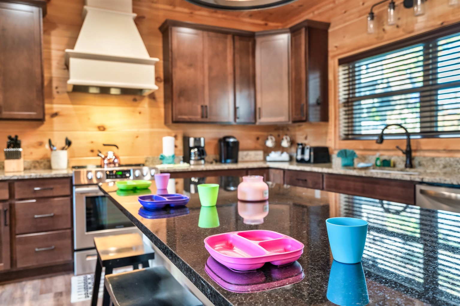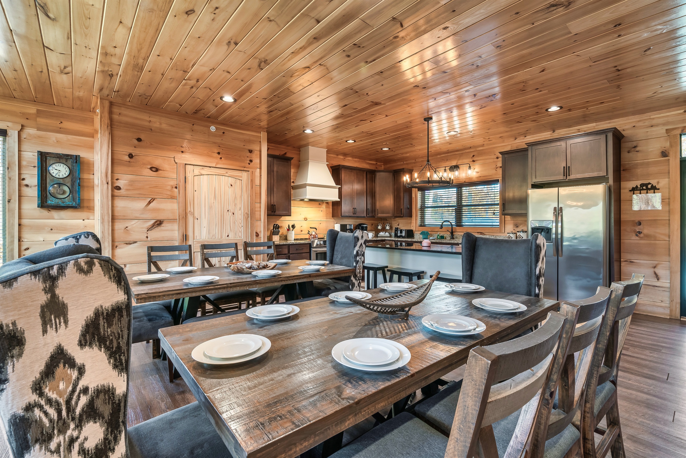 As you step inside, you’re greeted by an elegant, fully equipped gourmet kitchen featuring stainless steel appliances, granite countertops, and all the tools needed to prepare delicious meals for your group. With two large dining tables and place settings for 24, everyone can gather comfortably to share meals, play games, or simply enjoy good company.