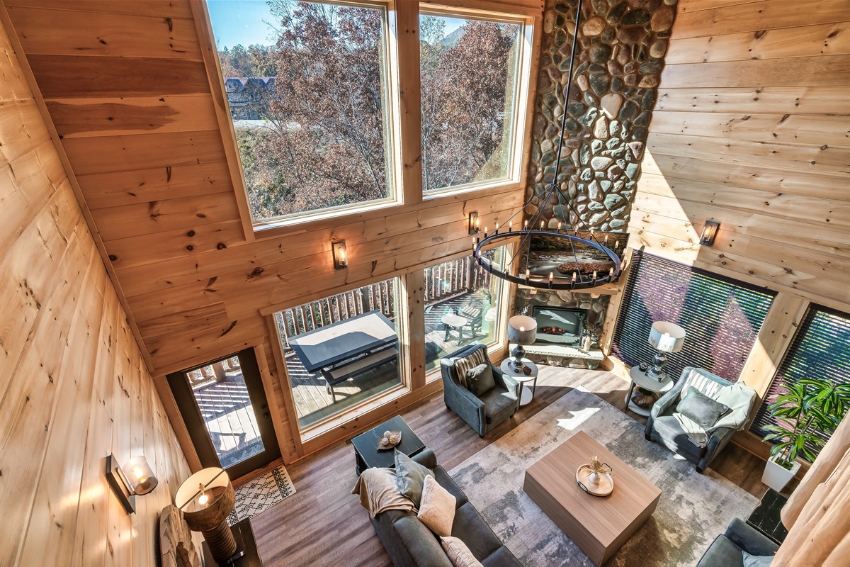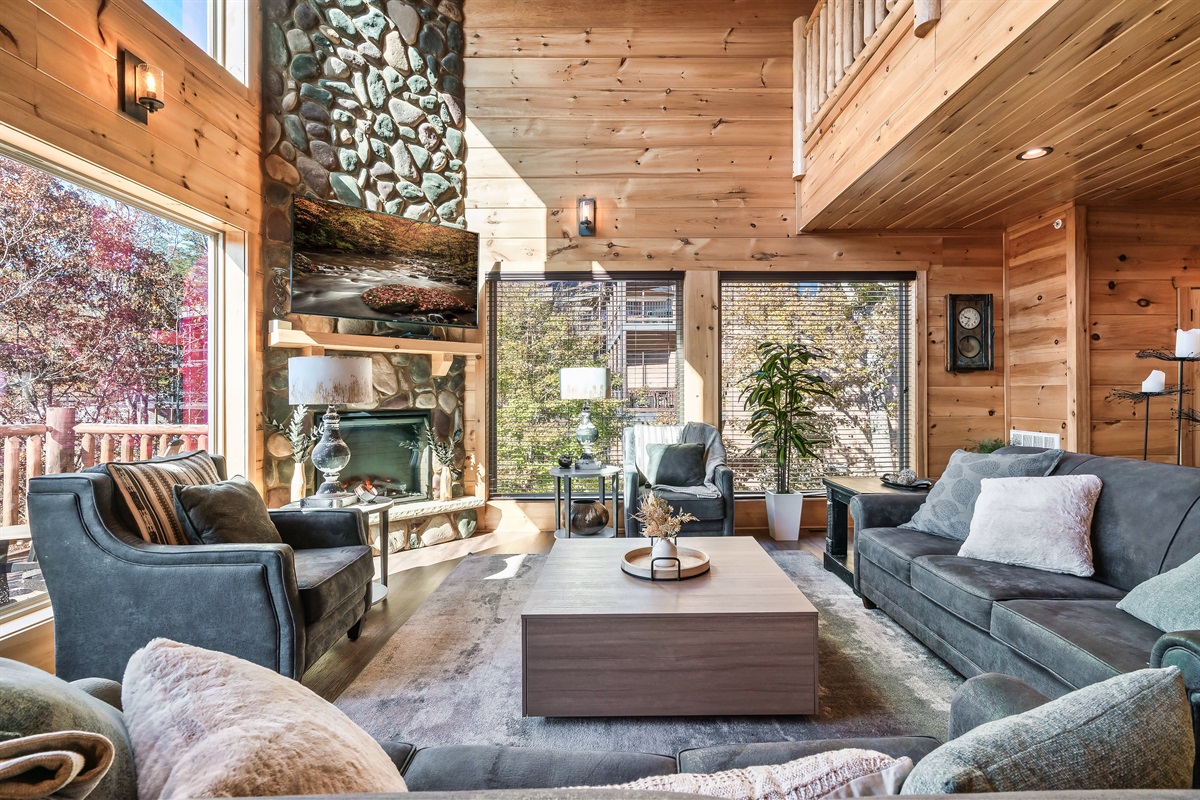 The kitchen opens into a two-story great room with soaring ceilings, floor-to-ceiling windows, and a magnificent stone fireplace that creates a cozy yet grand atmosphere. The natural light and mountain scener pour in, giving you that peaceful “cabin in the woods” feeling with a touch of luxury.