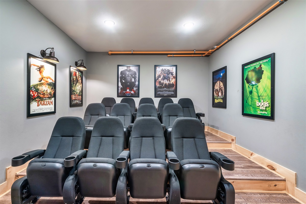 Downstairs is where the excitement truly begins. Watch movies or play video games in your private theater on a massive backlit 86-inch screen with real stadium seating, and popcorn maker. The adjoining colorful game room offers endless entertainment with a pool table, arcade machine, foosball table, poker table, nerf gun wall, and comfortable seating areas to relax between rounds.